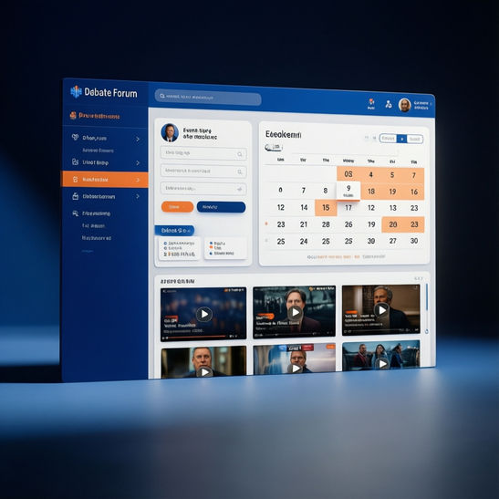 A central hub for civil discourse and opinion sharing, designed with an epic and grand aesthetic. Features include user sign-up for debate leagues and judge panels, an event calendar, and integrated YouTube video sharing.